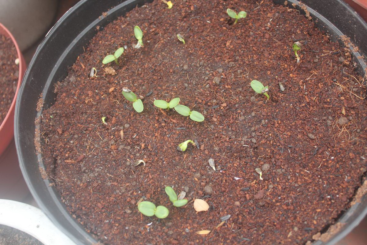 Nếu ươm vào chậu: Cho đất đã trộn vào đầy chậu, sau đó dùng nước tưới đẫm, đất sẽ sụt xuống dần dần lấp đầy chỗ trống. Khi đất đã ổn định cách mặt chậu khoảng 6 cm thì dừng lại, phủ lên bề mặt trên cùng một lớp dày khoảng 2 cm đất xơ dừa (hoặc dùng viên nén sơ dừa, đất tribat). Cho các hạt vào vị trí định trồng trên chậu (Hoặc cho nhiều hạt – tùy bạn), tiếp tục phủ lên một lớp đất xơ dừa (hoặc dùng viên nén sơ dừa, đất tribat) dày khoảng 2 cm nữa. Dùng bình tưới phun sương tưới đều cho ướt đẫm